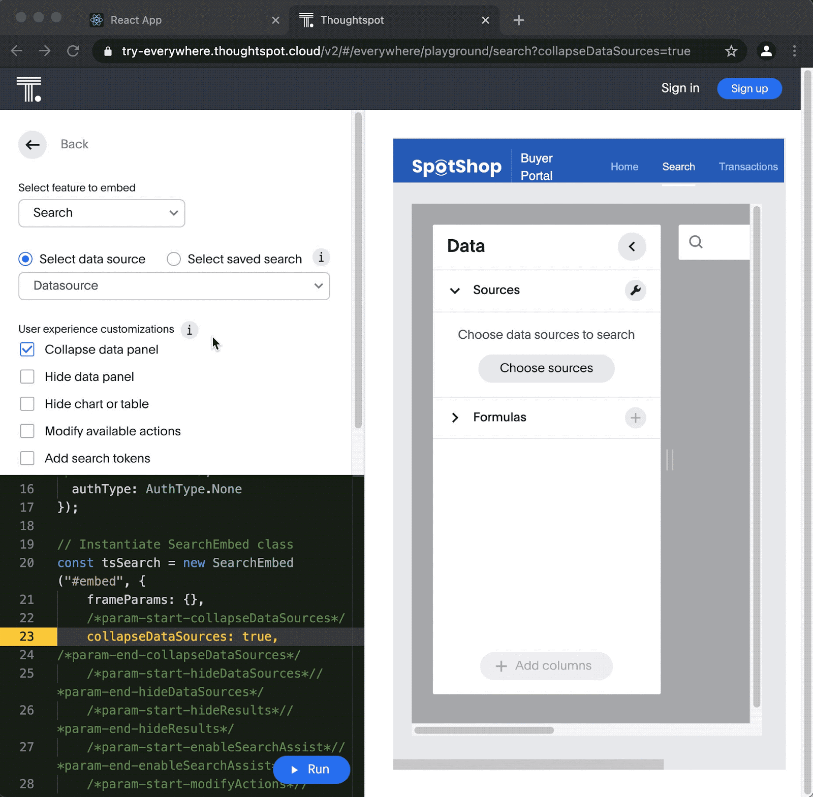 Of course, options like hideDataSources are easy to simply type into the code, but what about options that require more dynamic values like datasource guids? This is where the ThoughtSpot Everywhere Developer Playground comes in incredibly handy. The Playground is a web-based tool which lets you interact with your ThoughtSpot instance and have code generated for you. In fact, we could have used the Playground to generate the majority of the code for this tutorial! Let’s log into the Playground to get the database guid for the Sample Retail datasource and generate our search string.