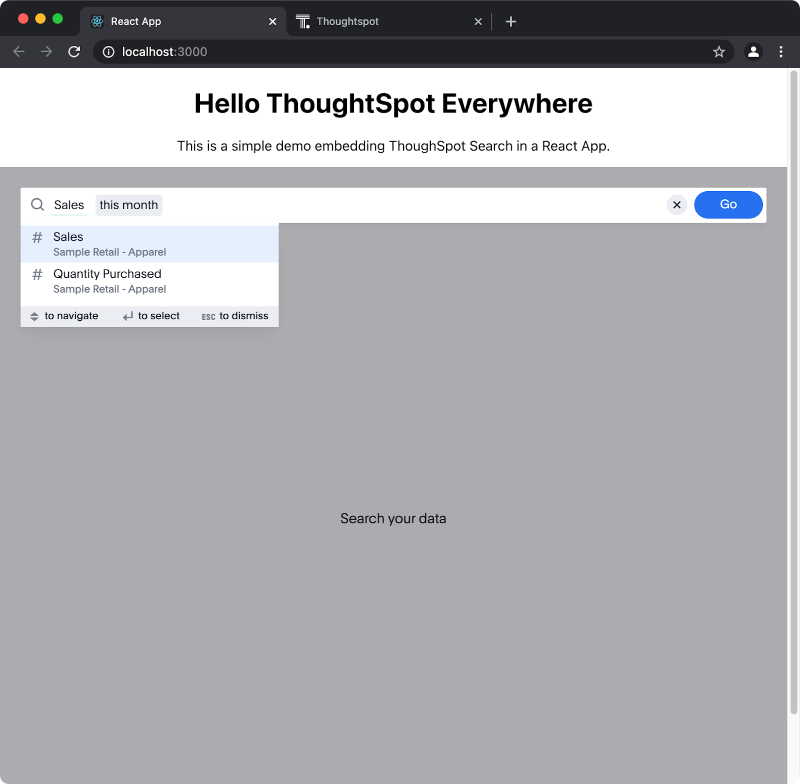 That’s it! You can now utilize ThoughtSpot search functionality in any app. Let’s run it and test (you may have to stop and start your npm server if your changes are not automatically reloaded) everything out. After logging in with your trial credentials, select Sample Retail from the data source, and enter the following search criteria, “Sales this month”.