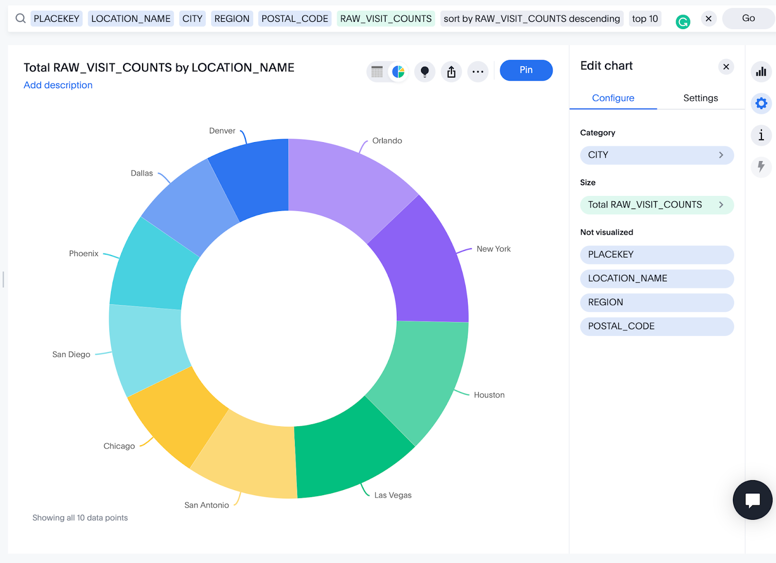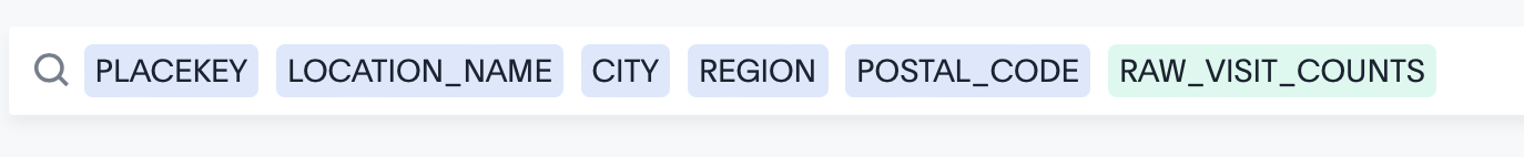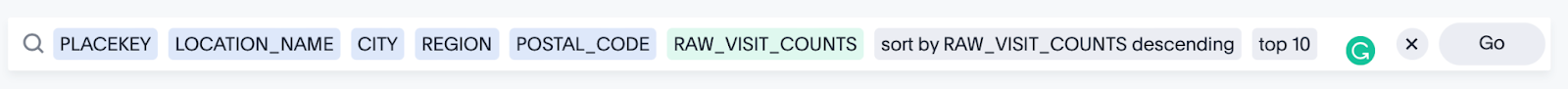 SELECT PLACEKEY, LOCATION_NAME, CITY, REGION, POSTAL_CODE, RAW_VISIT_COUNTS FROM PUBLIC.PATTERNS ORDER BY RAW_VISIT_COUNTS DESC LIMIT 10;