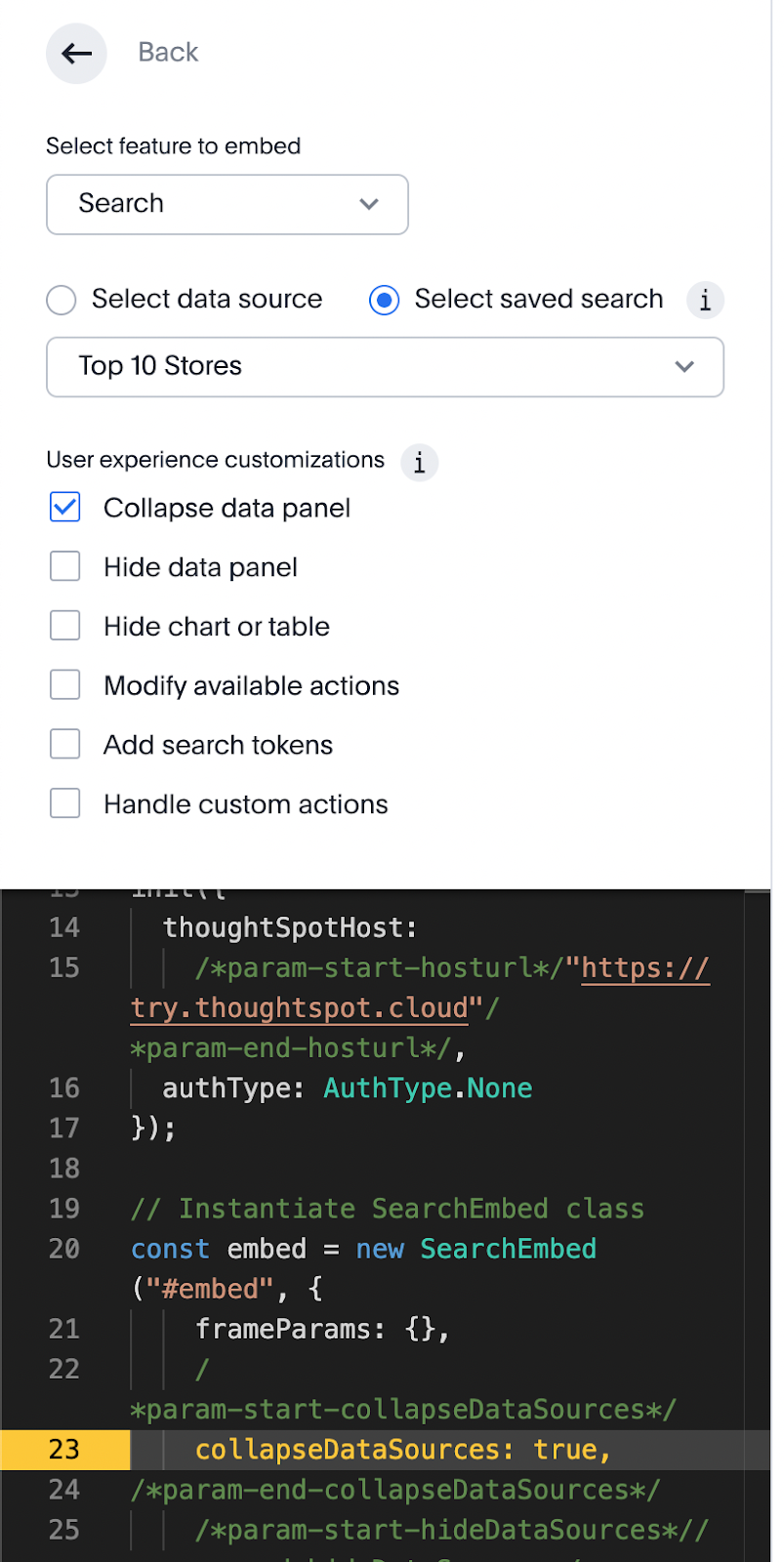If you remember from the Developer Playground, there were also a number of configuration parameters you could set, one of these is to automatically collapse or disable the data panel on the left. We can easily add that to our SearchEmbed component to clean up the UX.