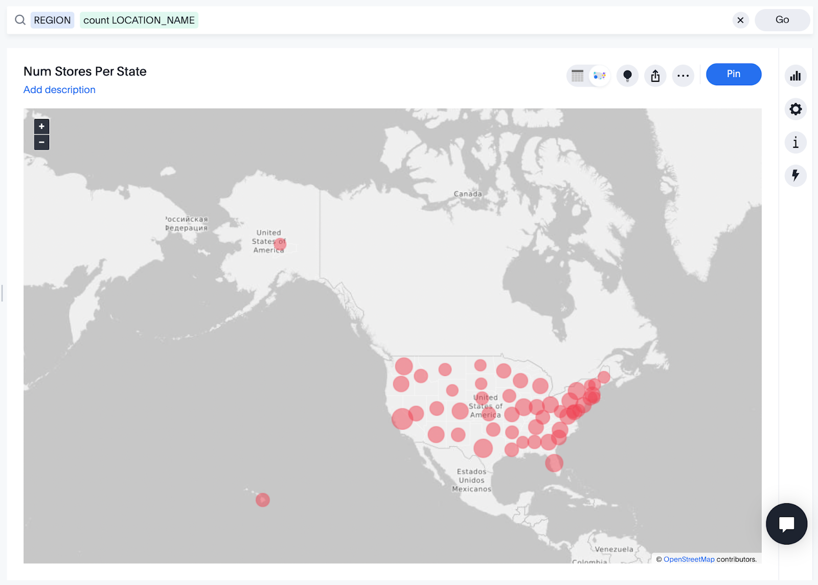 Tap Answers in the top navigation and select the Num Stores By State answer you started previously. You may notice that a Geo Area chart type has now automatically been associated with your answer. Tap on the change visualization button and choose Geo Bubble.