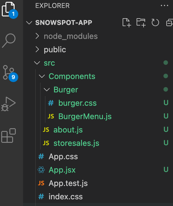 Then, create a new folder, Components, with a subfolder, Burger, and two files, burger.css and BurgerMenu.js. Once complete, your app structure should look like this: