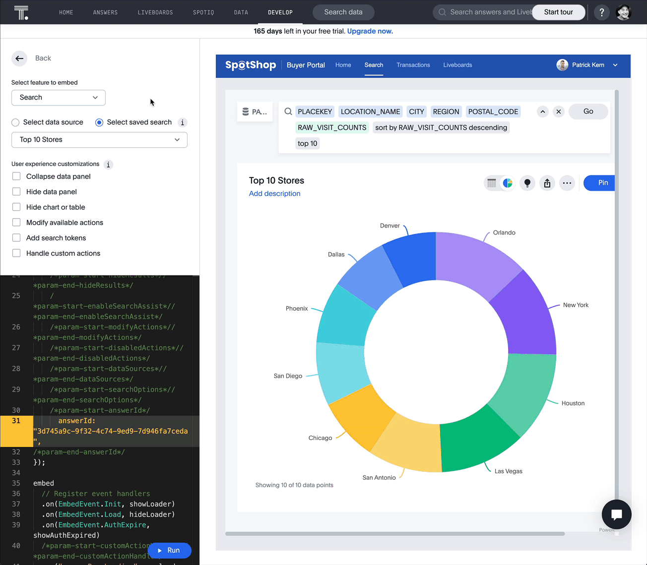 We want to start by embedding the Answer we created earlier. Tap Select saved search and choose Top 10 Stores from the dropdown list. Once selected, tap run to see your answer render on the right hand side.