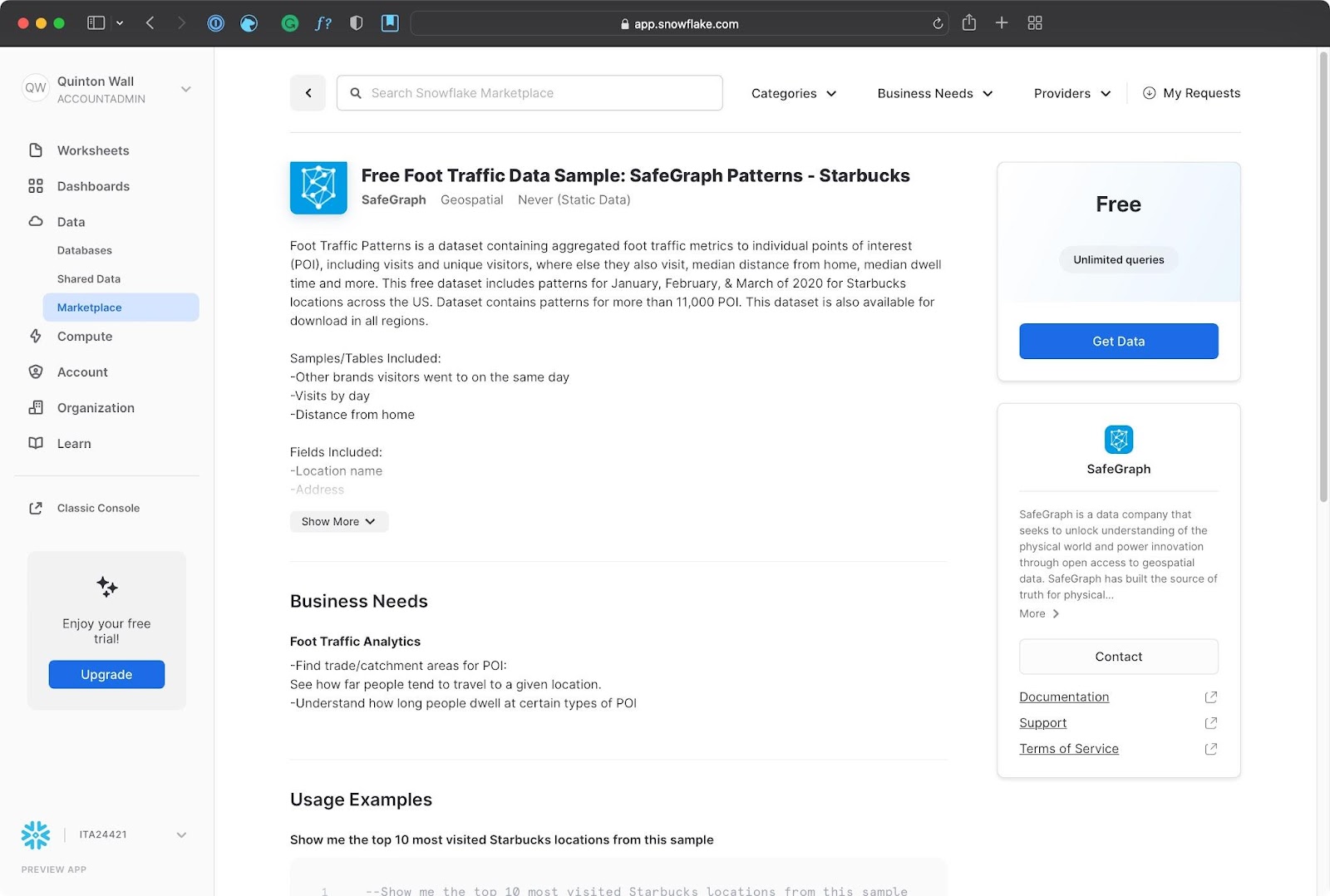 Jump over to the Snowflake Free Trial signup page, enter the details required, and tap continue. Follow the steps required and check your email for an Activation link. Once you are logged in, tap on Marketplace. We will take advantage of the Snowflake Data Marketplace and add a sample dataset which we want to derive analytics from. Select SafeGraph from the Providers dropdown, then tap on Free Foot Traffic Data Sample: SafeGraph Patterns - Starbucks. Tap Get Data and follow the steps to add the dataset to your account. We will use the ACCOUNTADMIN role for the tutorial.