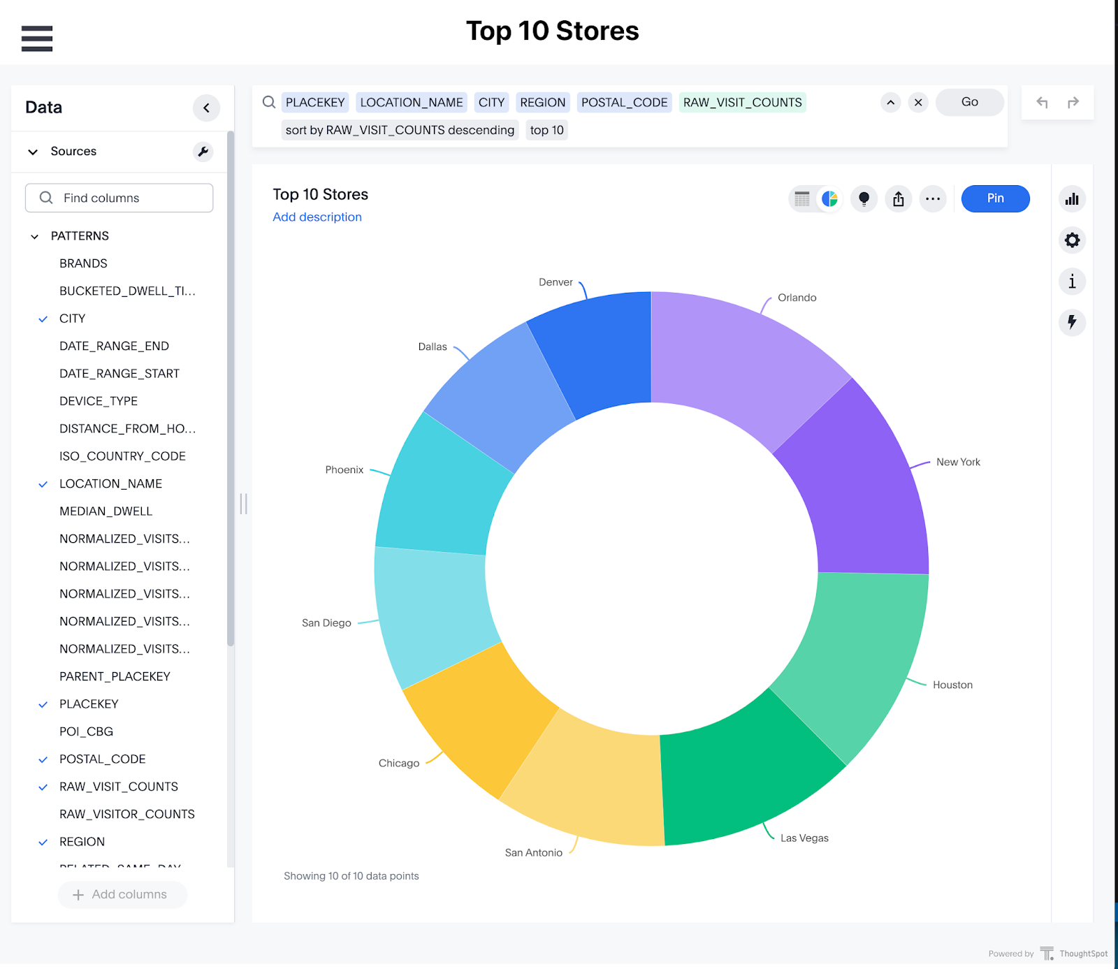 ThoughtSpot makes it incredibly easy for anyone to search data. Using powerful AI, users can type natural language searches to find and save the answers they need. Let’s start by finding the answer to “what are the top 10 most visited Starbucks locations?”.
