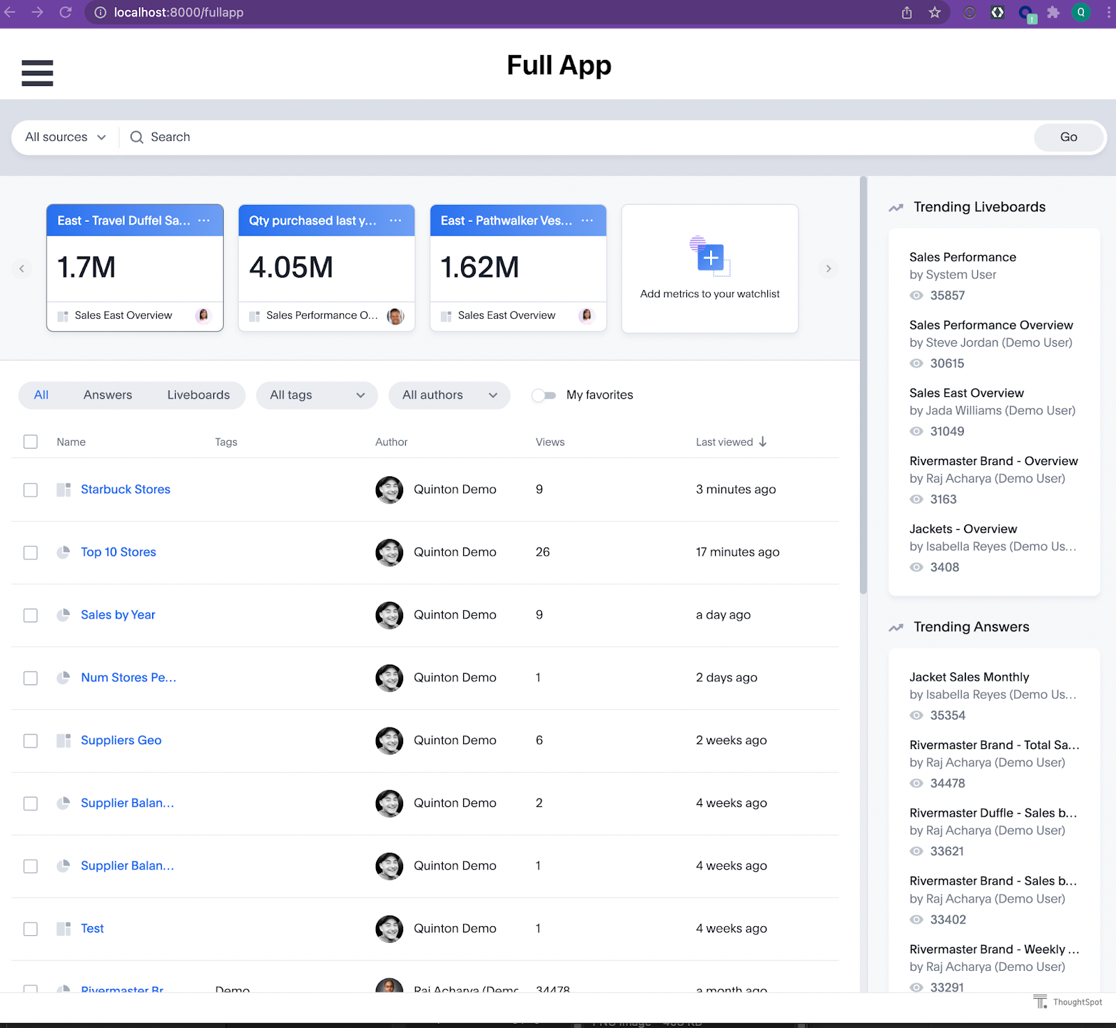 So far we have embedded individual components: Answers and Liveboards, into our React app. If you want to embed the entire ThoughtSpot experience, you can achieve this using the FullApp React component. By now the process should be pretty familiar. Let’s jump in.