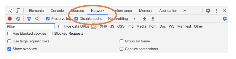 To avoid cached versions of your code during the development, you should also disable the cache. With the developer tools pane open, click on the Network tab, then make sure the option to Disable cache is selected.