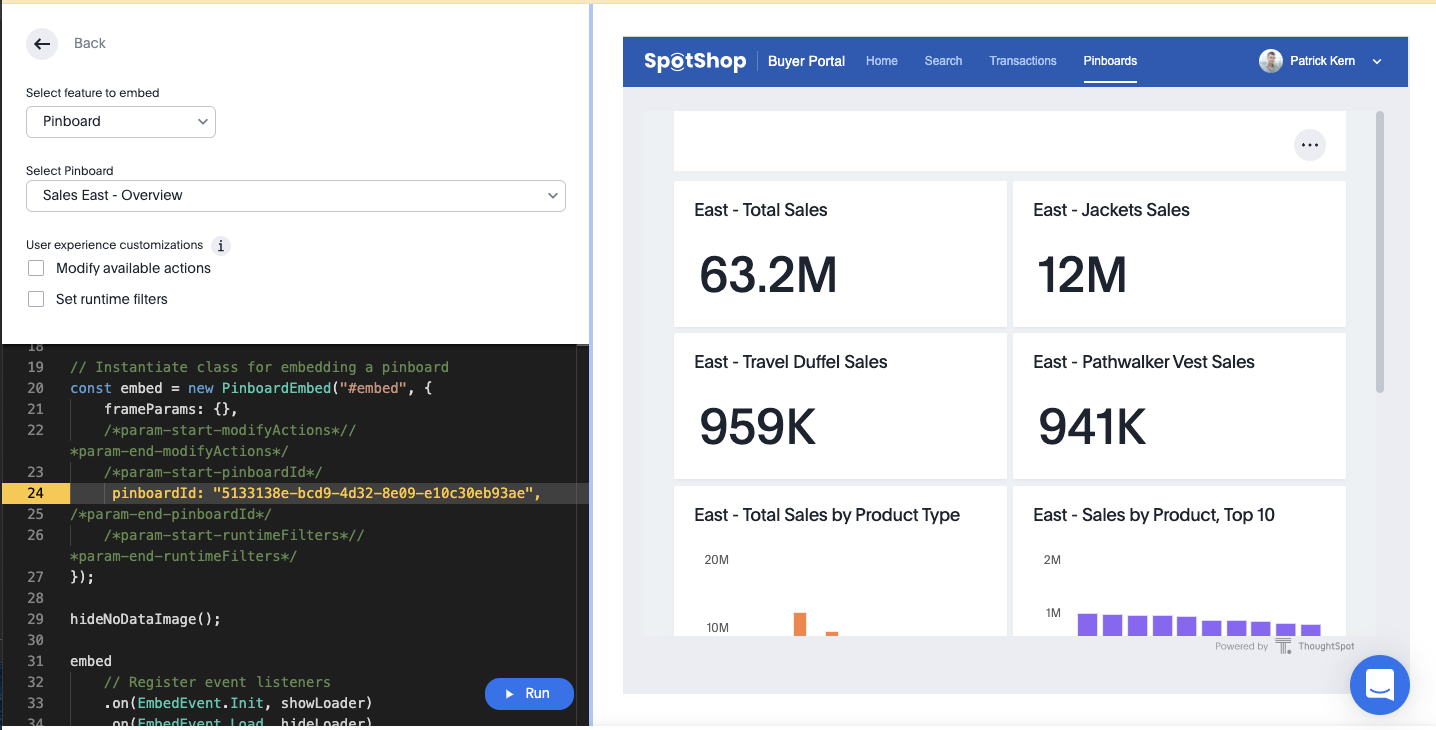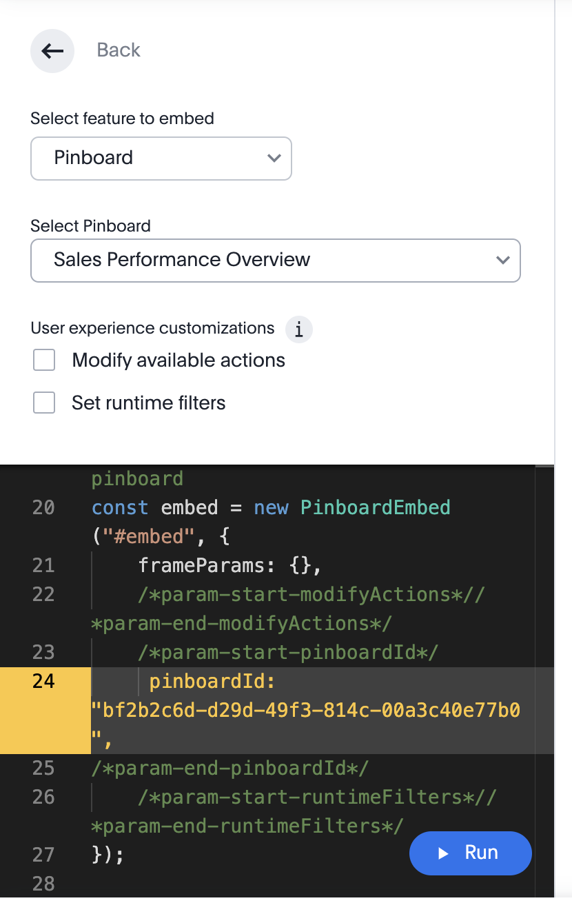 Before you can embed a liveboard you need to get the pinboard ID. To get the ID, use the Developer Playground again, but select Liveboard and then select a liveboard from the drop-down menu.