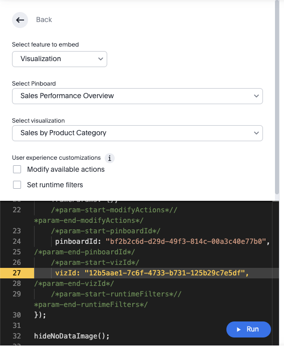 vizId: '12b5aae1-7c6f-4733-b731-125b29c7e5df', / TODO - set to your visualization ID.