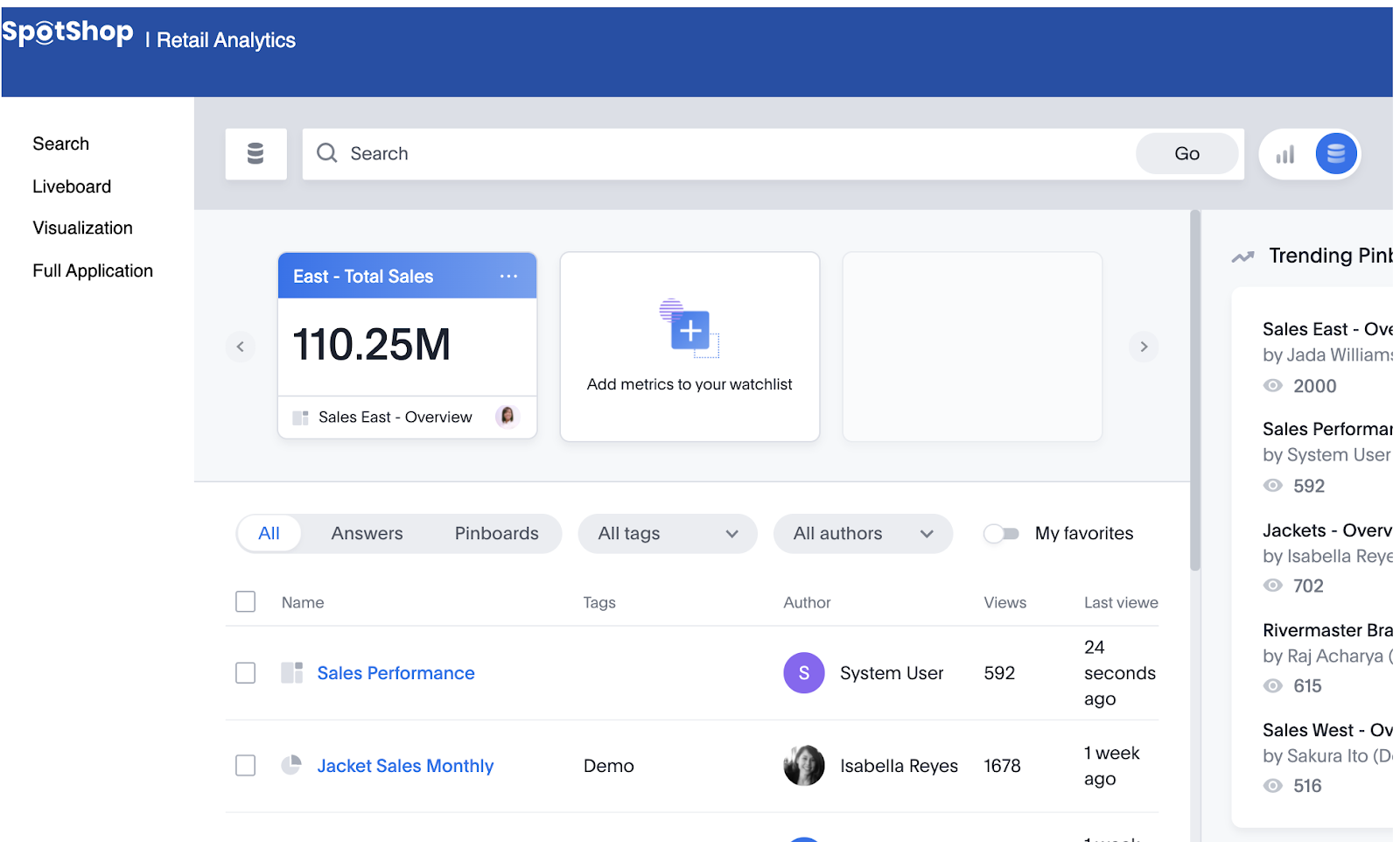 This sample shows full embedding with the starting page being the Home page. You can specify any of the pages, such as Data, Liveboards, etc. See the documentation for the full list of parameter options.