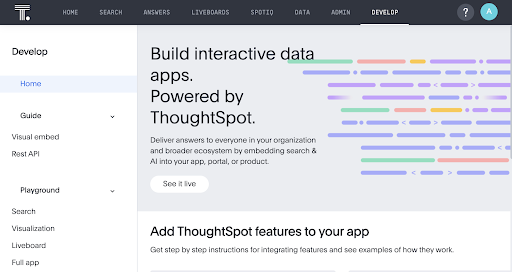 Access the Developer Portal by first logging into ThoughtSpot and then clicking the Developer tab. You will need to be logged in with either Admin or Develop privileges.