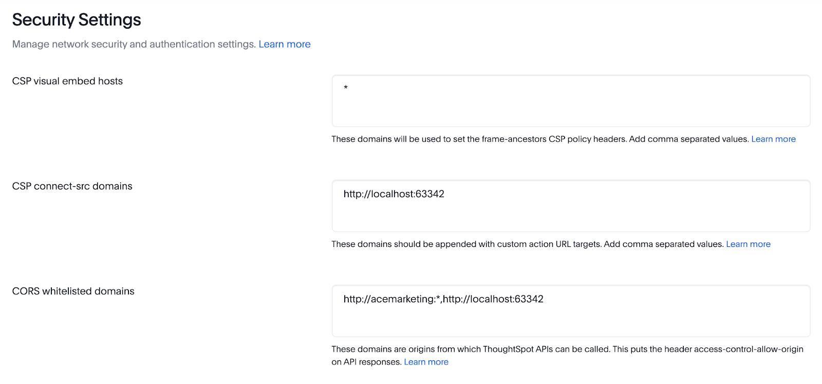 The CSP visual embed hosts setting specifies the domains that will be allowed to connect via the SDK. Enter your full URL for the embedding app, such as http://localhost:8000. For testing purposes, you can set this to star (asterisk) and any domain can connect. It is recommended that you use specific URLs for production environments for best security.