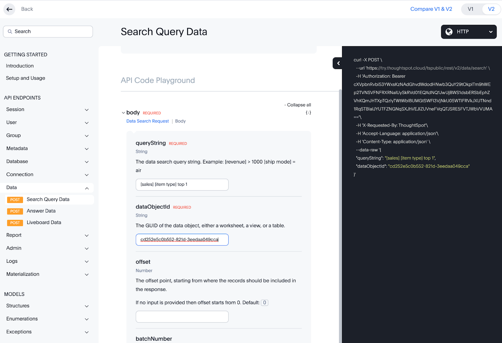 Log in your ThoughtSpot instance, tap Develop > REST API Playground v2, then from the left-hand navigation, expand Data, and select Search Query Data. Try adding your worksheet id and search term defined in the constants above., then tap Try it out.