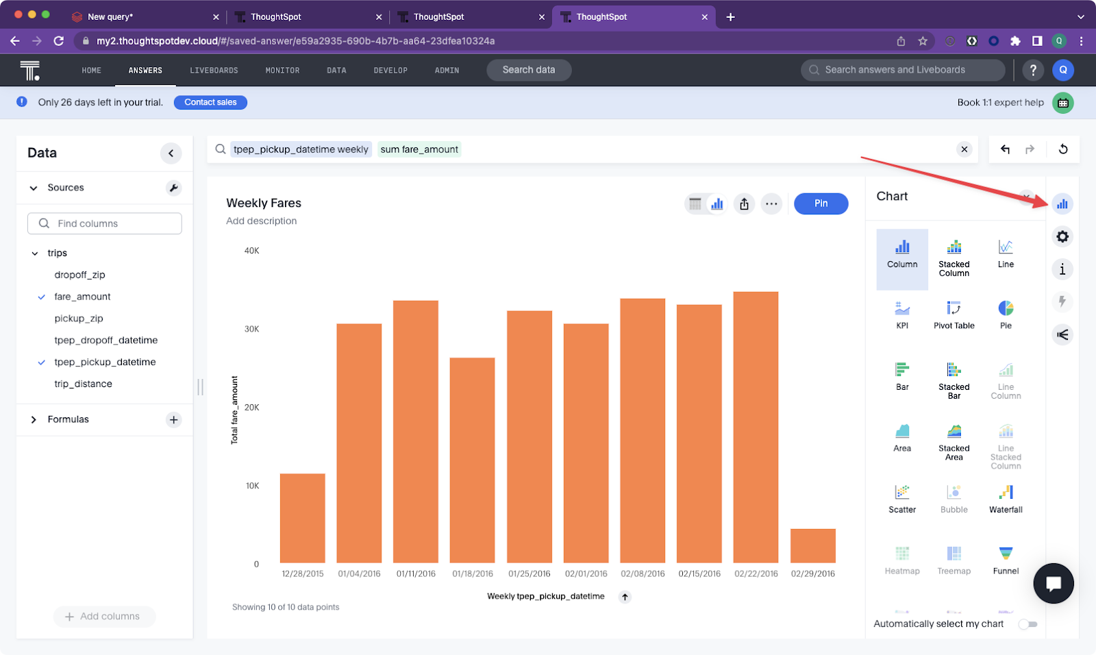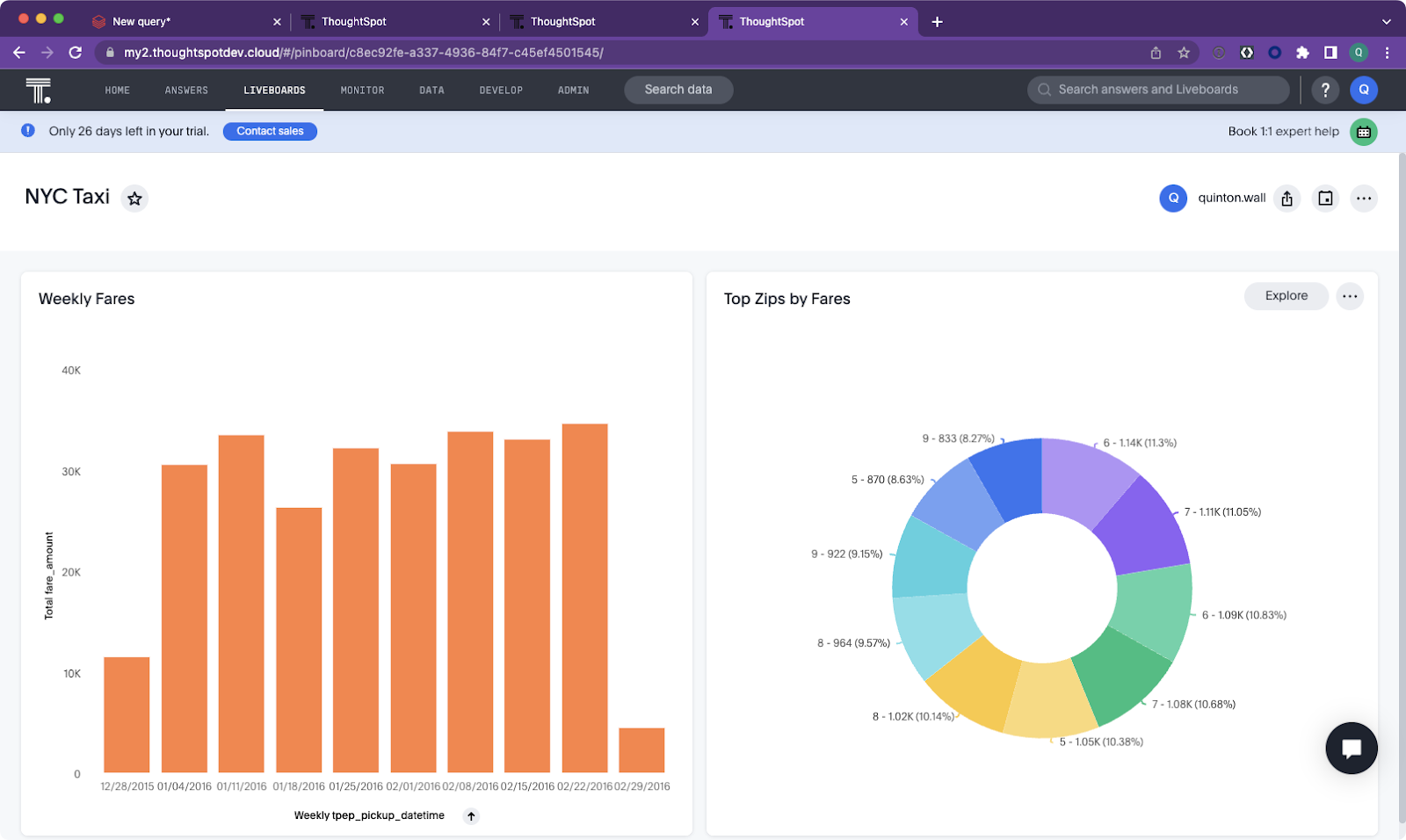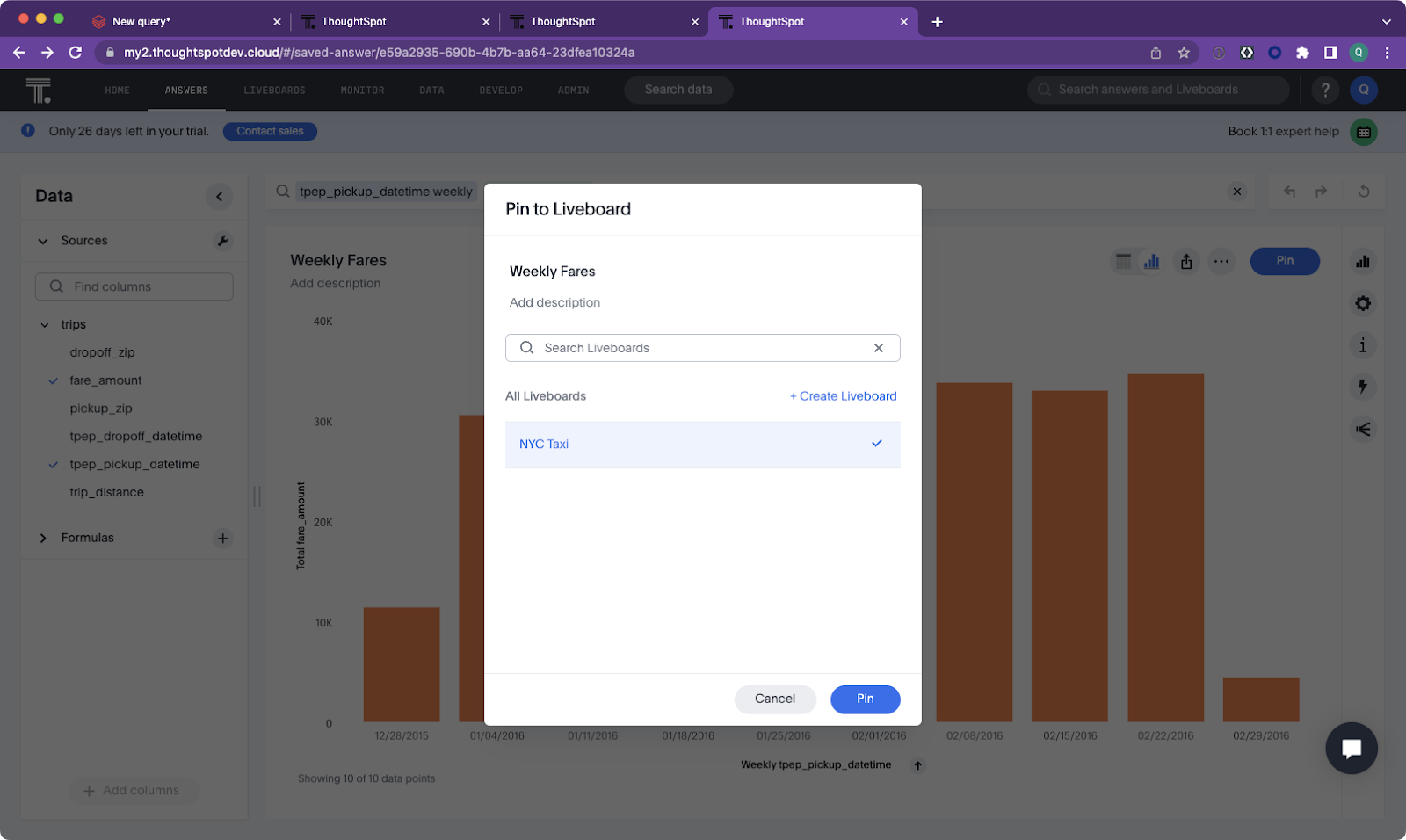 To make it easy for users to view all of the answers we’ve uncovered for Taxis, let’s combine them into a single Liveboard. You can think of a Liveboard as being similar to a traditional dashboard. Unlike dashboards, which provide a static picture of data, Liveboards allow users to drill down into the answer provided to perform further analysis as they have more questions.
