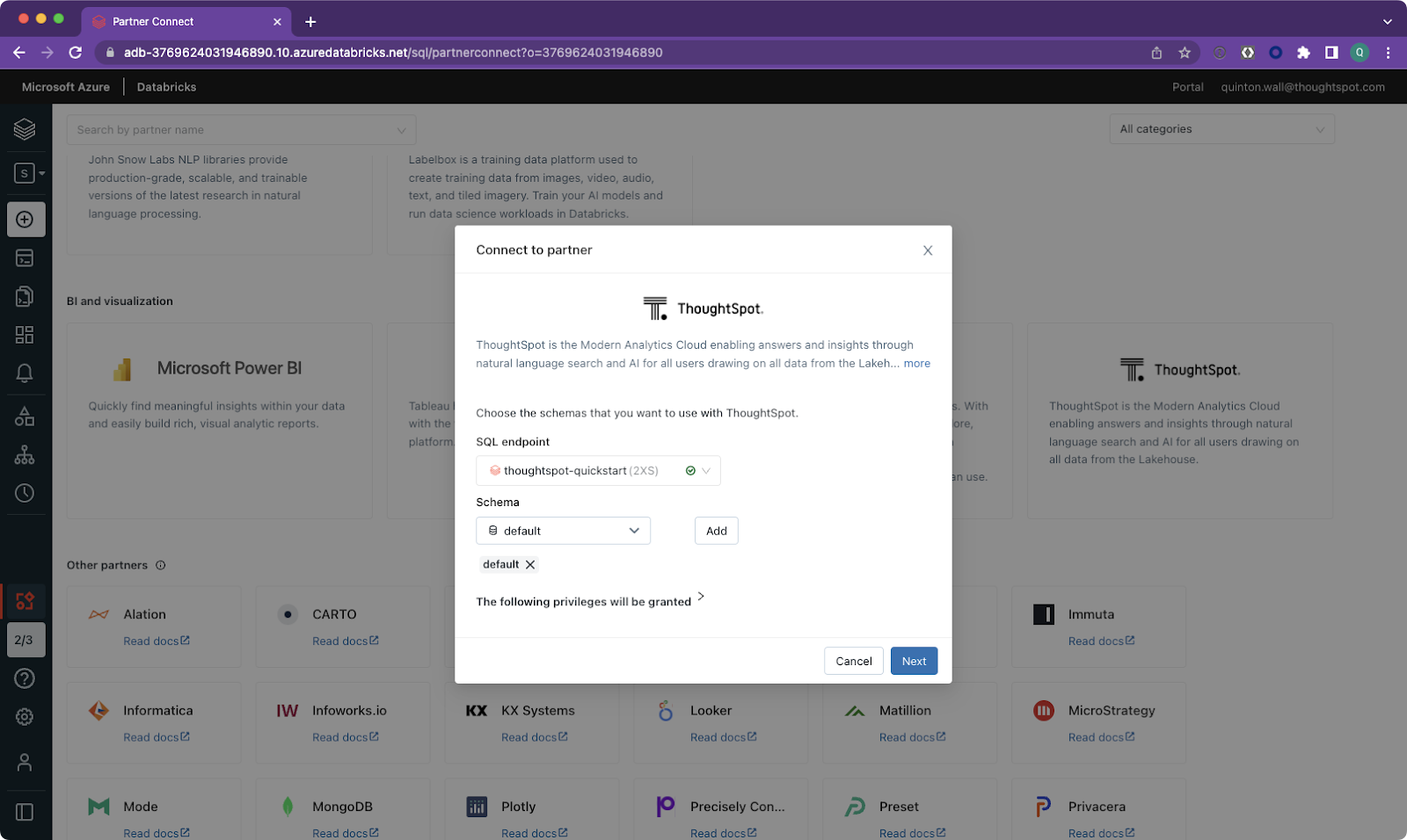 In the final screen, you will see the email which is associated with your Databricks account. This will be used as your username to access ThoughtSpot. You can not change this. If you already have a ThoughtSpot instance associated with this name, it is recommended that you create a new Databricks trial account, or log into Databricks as a different user.