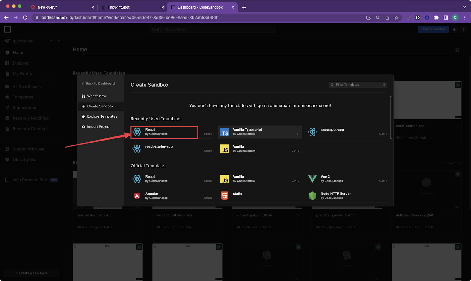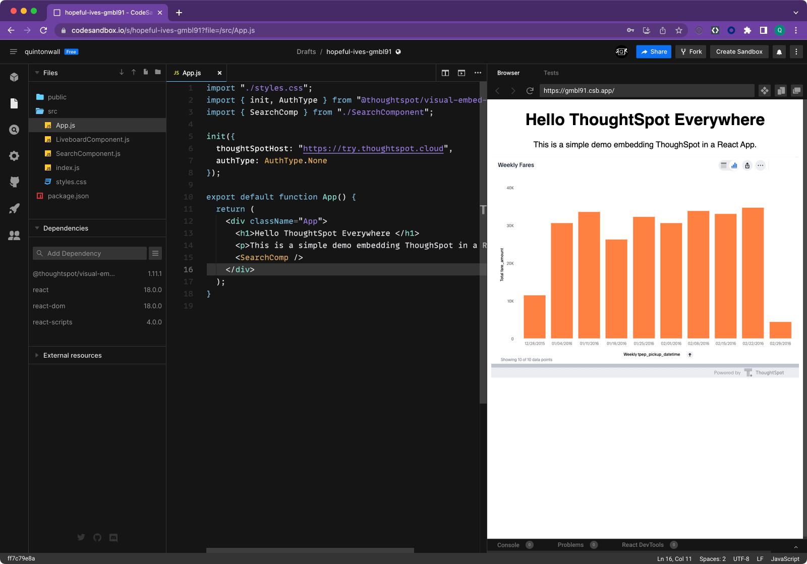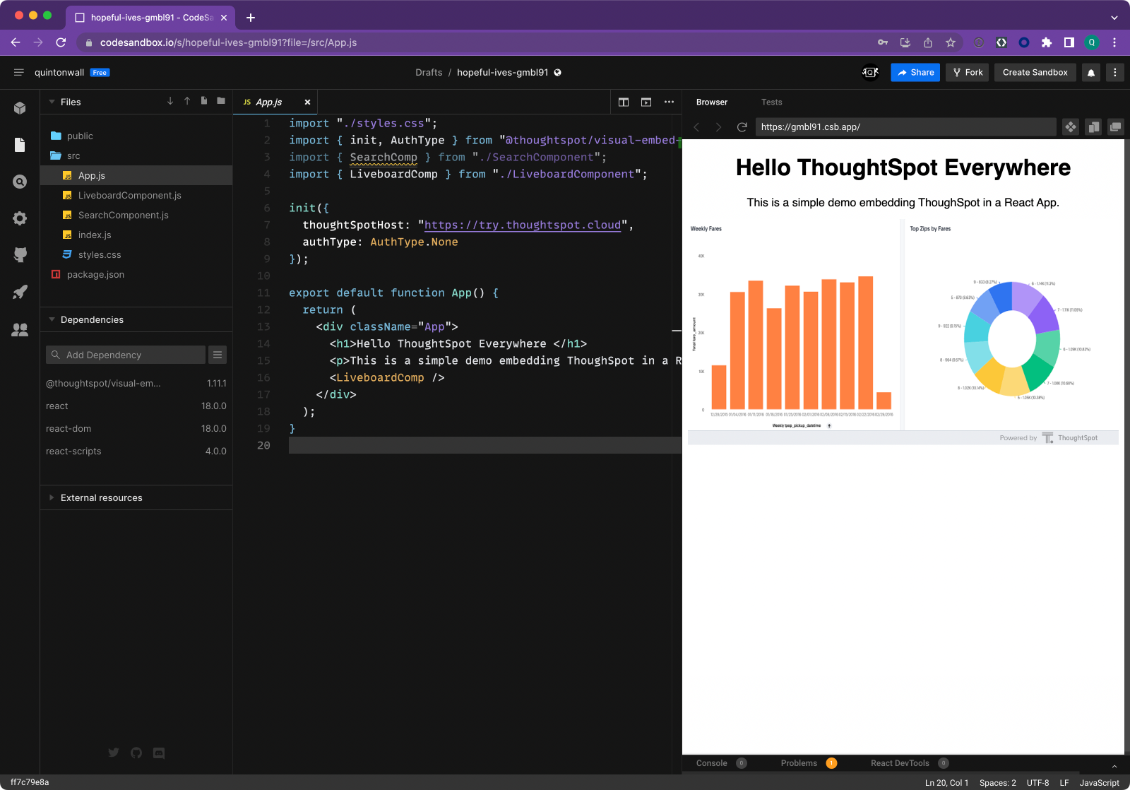 To make things easy, we will use Code Sandbox, a web based IDE and runtime environment for building web apps. Using Code Sandbox means we don’t need to spend time configuring our local environment for React development. The good news is that ThoughtSpot Everywhere uses the languages and developer processes you already know and love. If you already have your local environment setup for React development, feel free to use that.