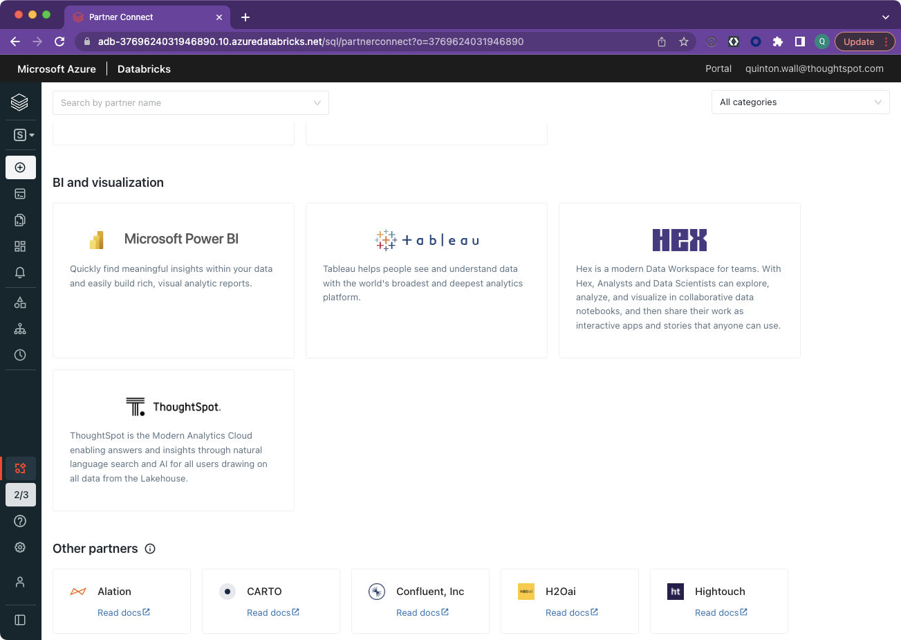 From the left hand navigation, select Partner Connect, then scroll down to the BI and Visualization section. Select the ThoughtSpot tile to start the connect wizard.