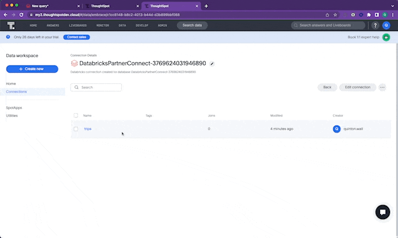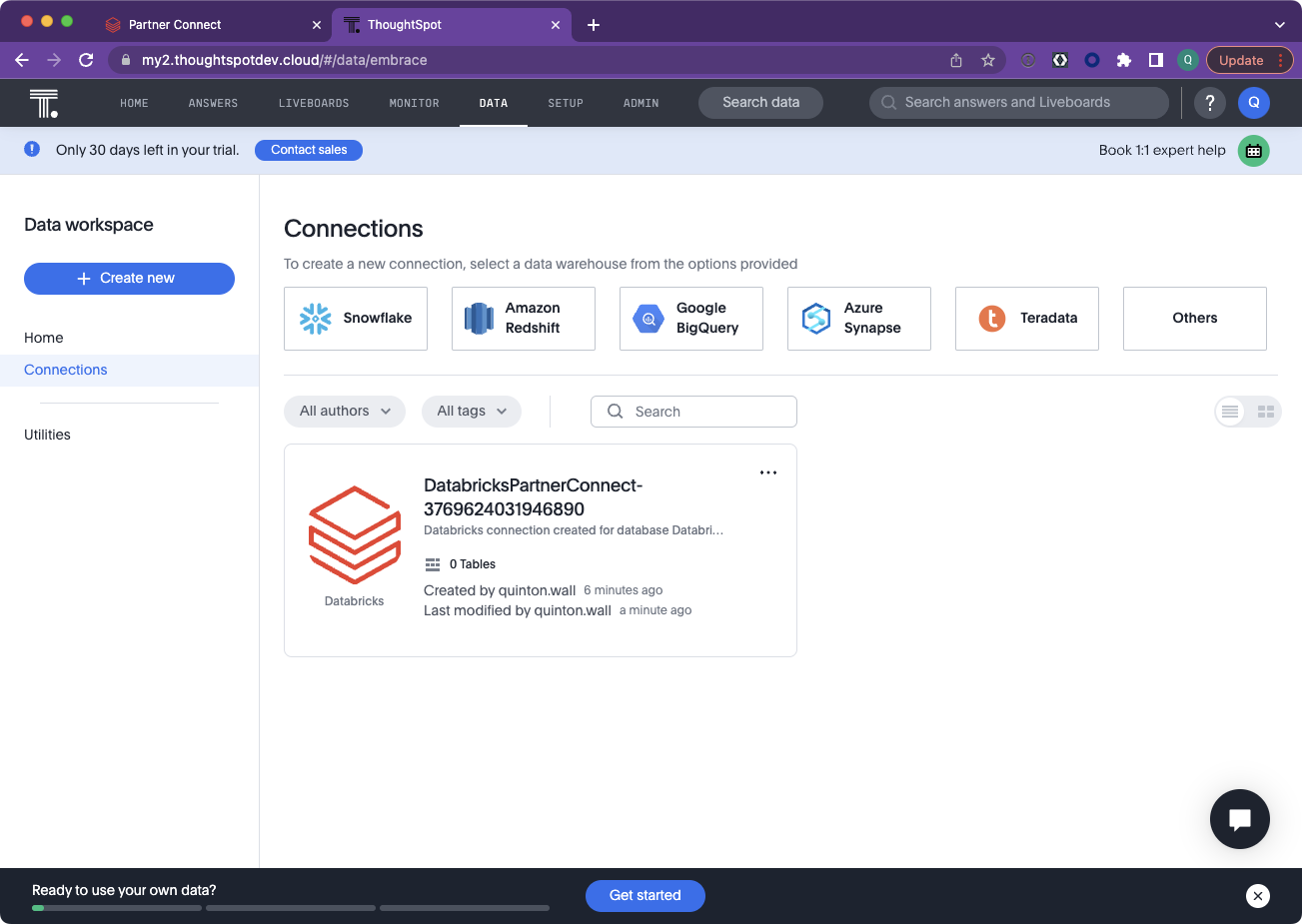 Once your SQL endpoint has started, let’s create a connection to ThoughtSpot using the new Partner Connect wizard. This wizard will automatically create a new ThoughtSpot free trial instance and connect it to Databricks for you.