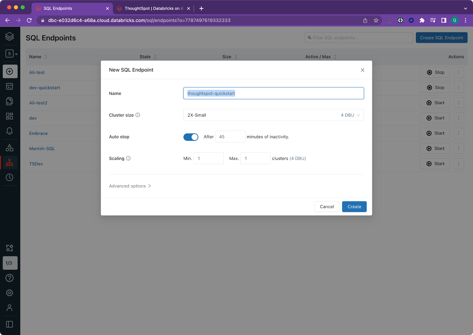 Next, create a new SQL endpoint. This endpoint will be used to create the connection with ThoughtSpot. It is good practice to create a new endpoint per connected system to ease maintenance and provide better security controls.