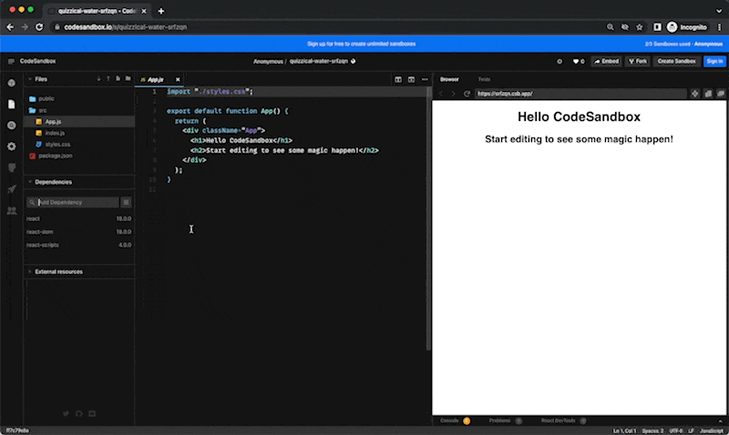In your browser, go to codesandbox.io and tap the Create a Sandbox button on the top right of the page, then select the React template. This will create a very simple web app, with code on the left, and rendered page on the right.