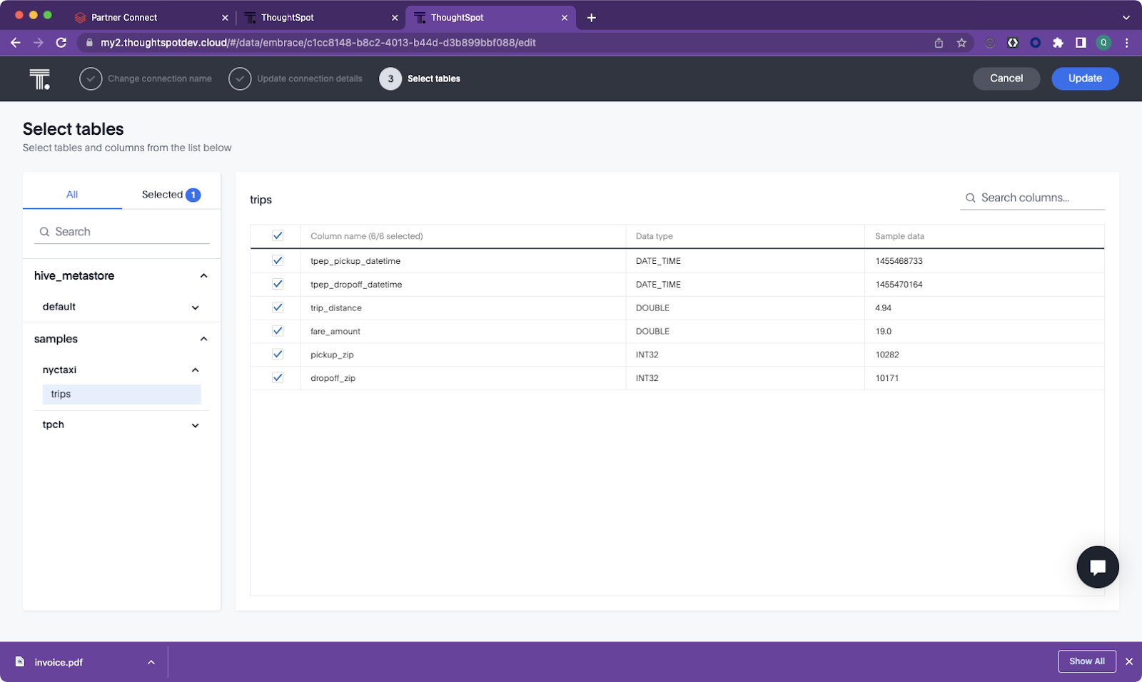 With the connection to Databricks created, it is time to tell ThoughtSpot which tables you want to sync. We are going to take advantage of the NYC table sample data which ships with Databricks. All we need to do is map the appropriate table and fields.