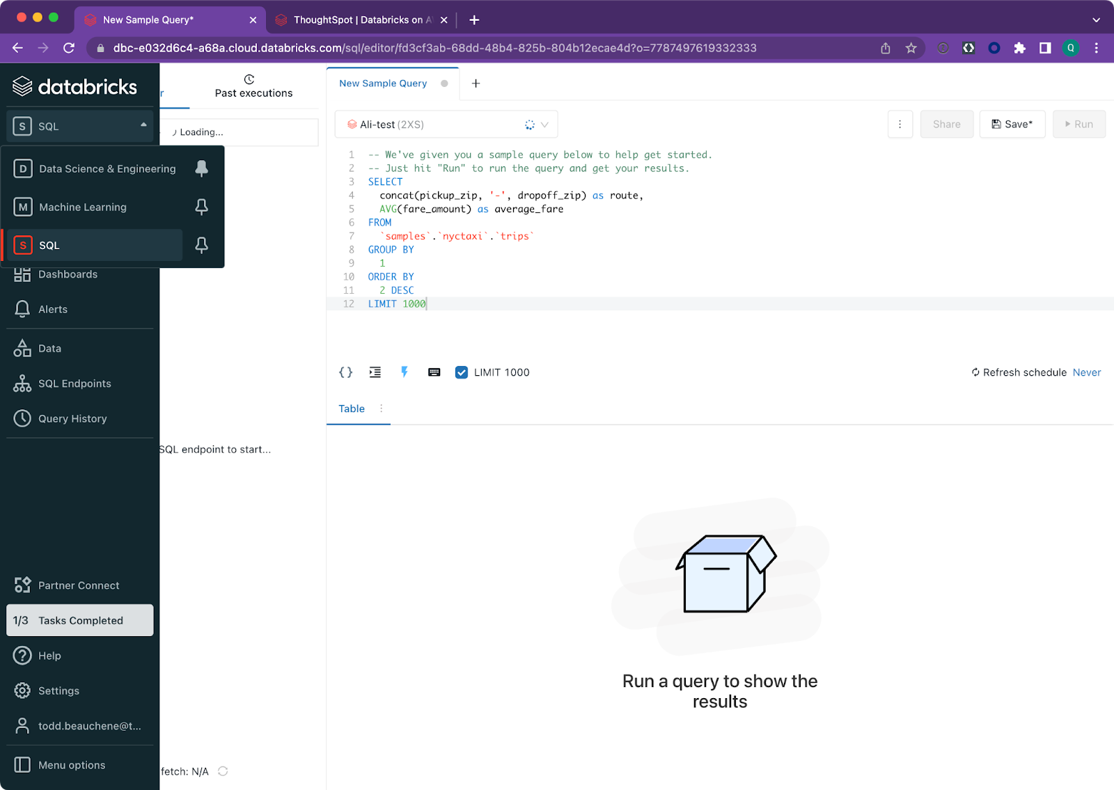 From the menu, select SQL endpoints, then create a new endpoint called thought-quickstart. The endpoint will automatically start up, but can take some time. If you already have coffee brewing, now’s a good time to pour yourself a cup.