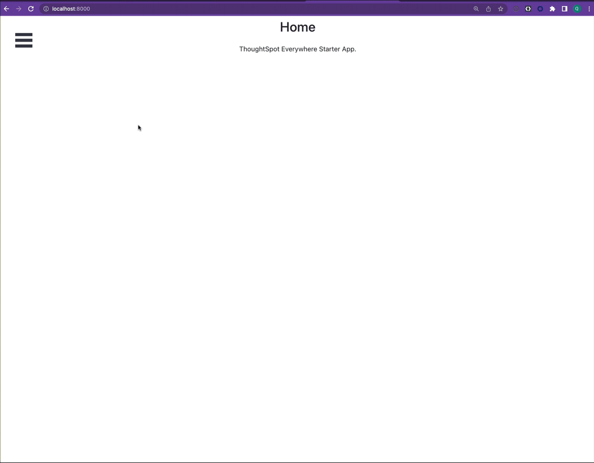 Once the app is up and running, navigate to http://localhost:8000. If this is the first time loading the app, you will have to log into ThoughtSpot to see data. If you don’t already have an account, go ahead and sign up for a 30-day free trial. Once you received your credentials via the email verification, you can continue.